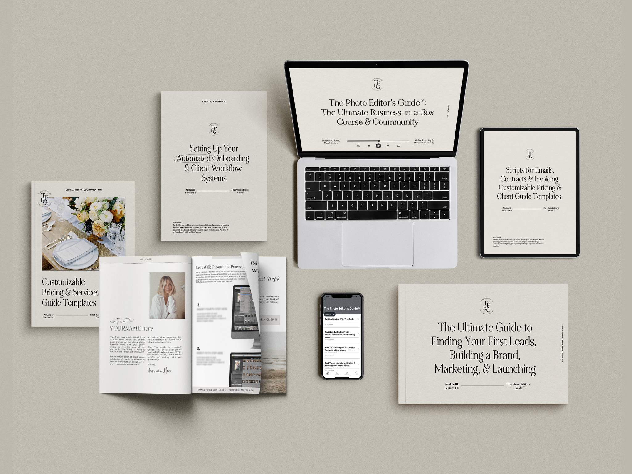 The Photo Editor’s Guide's signature course teaches you everything you need to know to become an in-demand photo editor quickly, with an expert to guide you, a wealth of done-for-you resources, tools & templates to equip you — plus, lifetime access to a private community to lean on as you grow.